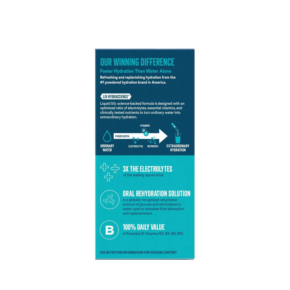 Formulated with LIV HYDRASCIENCE, Liquid I.V. uses an optimized ratio of electrolytes and clinically tested nutrients to support rapid hydration. Each serving contains three times the electrolytes of leading sports drinks, plus eight essential vitamins and nutrients—including 100% of your daily values for vitamins B3, B5, B6, and B12. It’s also gluten-free, soy-free, and dairy-free.