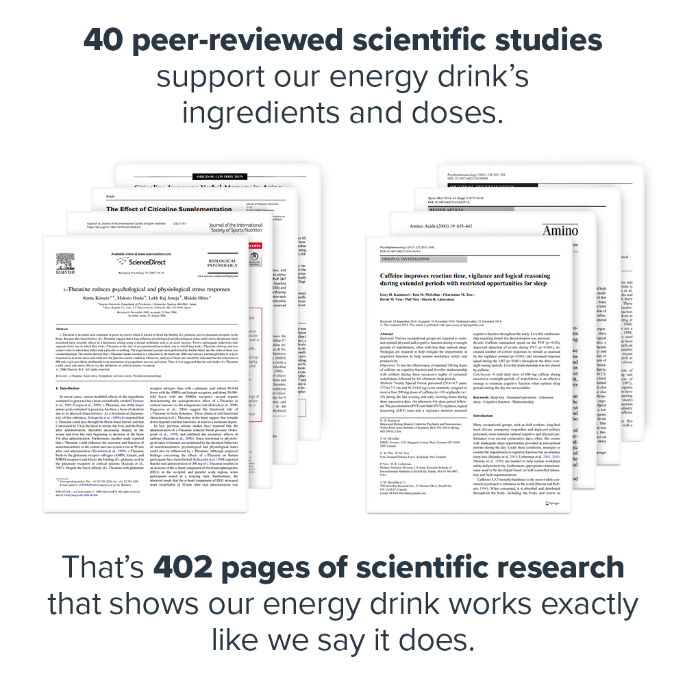 Backed by 404 peer-reviewed scientific studies, our energy drink is formulated with clinically supported ingredients and doses for maximum effectiveness.
