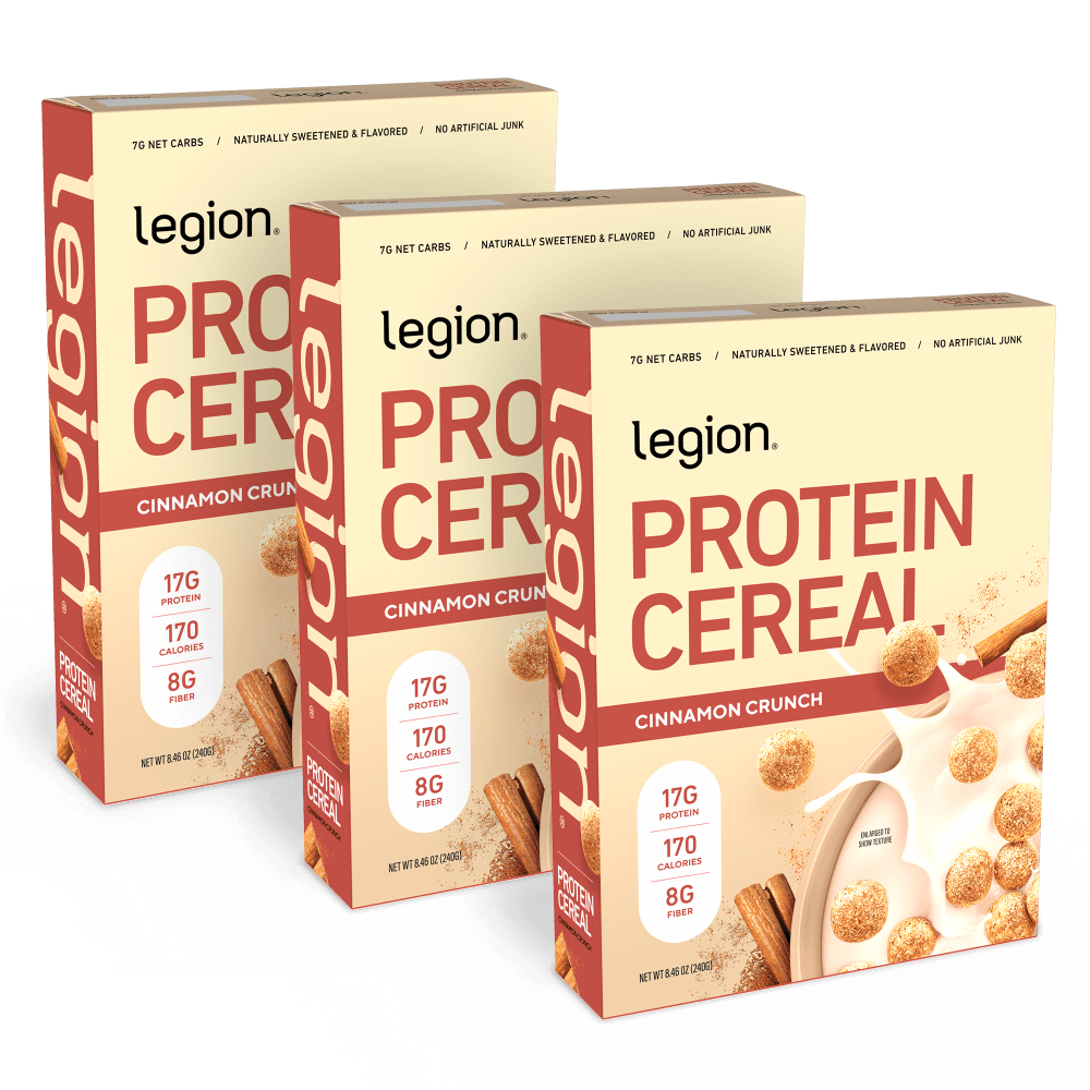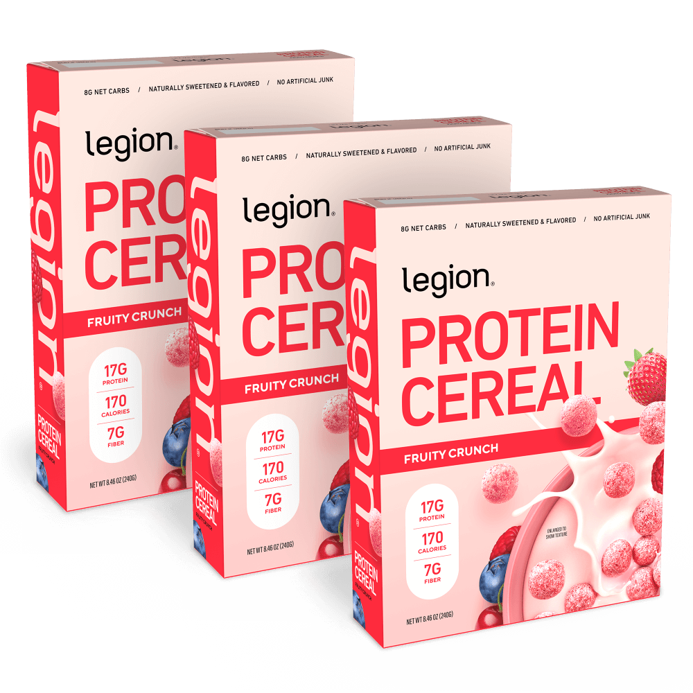 Legion protein cereal is made with a balanced blend of nutrients, featuring 15 grams of carbs and 6 to 7 grams of healthy fats sourced from nutritious plant-based ingredients like tapioca, chicory root, coconut oil, and stevia. It’s lightly sweetened with just 4 grams of added sugar — about one teaspoon — for a naturally delicious taste without the excess sugar.