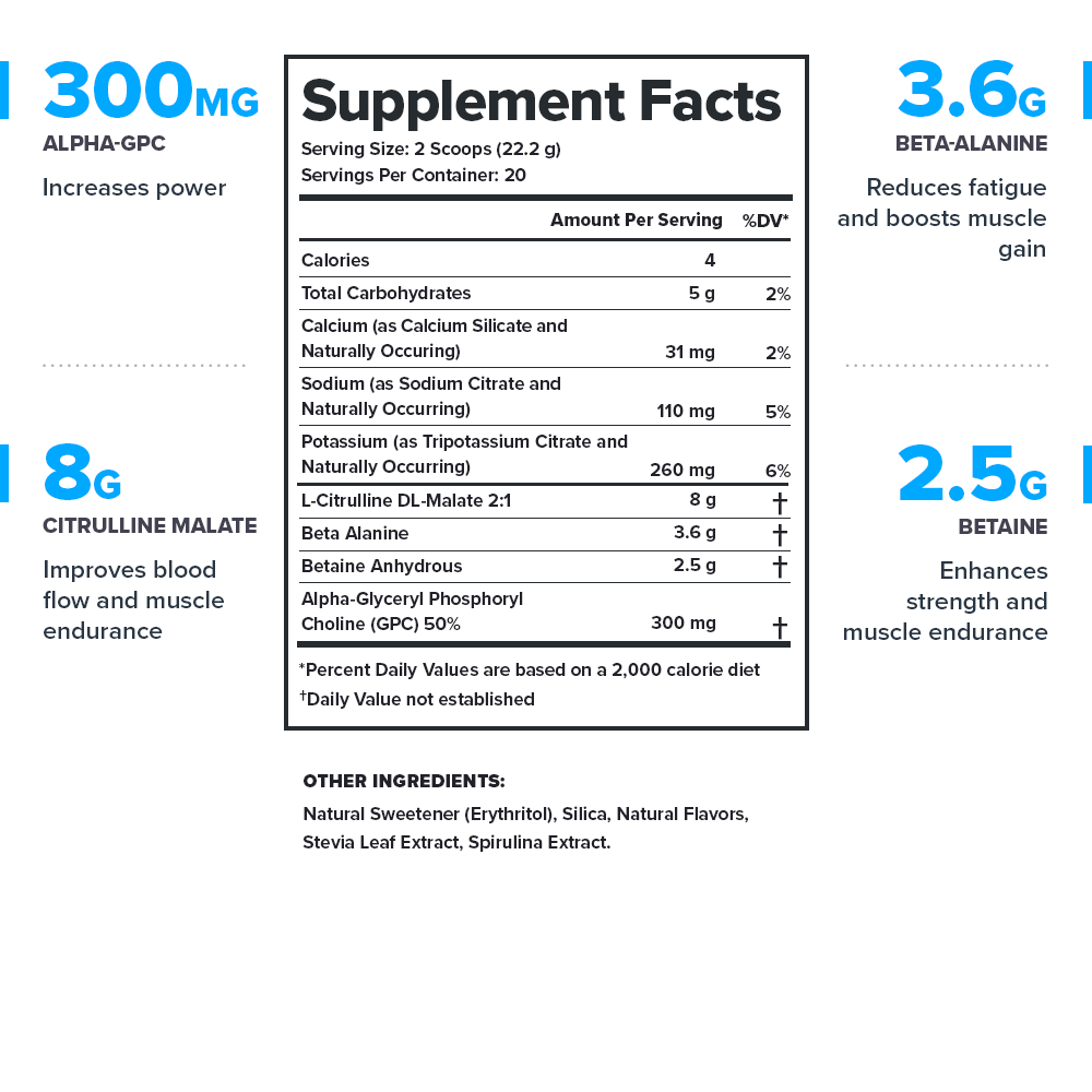 Discover the only naturally sweetened and flavored, stimulant-free pre-workout supplement formulated with clinically effective doses of 4 scientifically proven ingredients designed to boost strength, enhance stamina, and reduce fatigue — all without jitters or post-workout crashes.