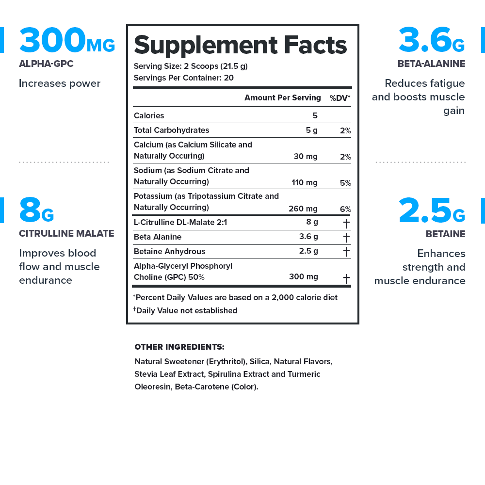 Discover the only naturally sweetened and flavored, stimulant-free pre-workout supplement formulated with clinically effective doses of 4 scientifically proven ingredients designed to boost strength, enhance stamina, and reduce fatigue — all without jitters or post-workout crashes.
