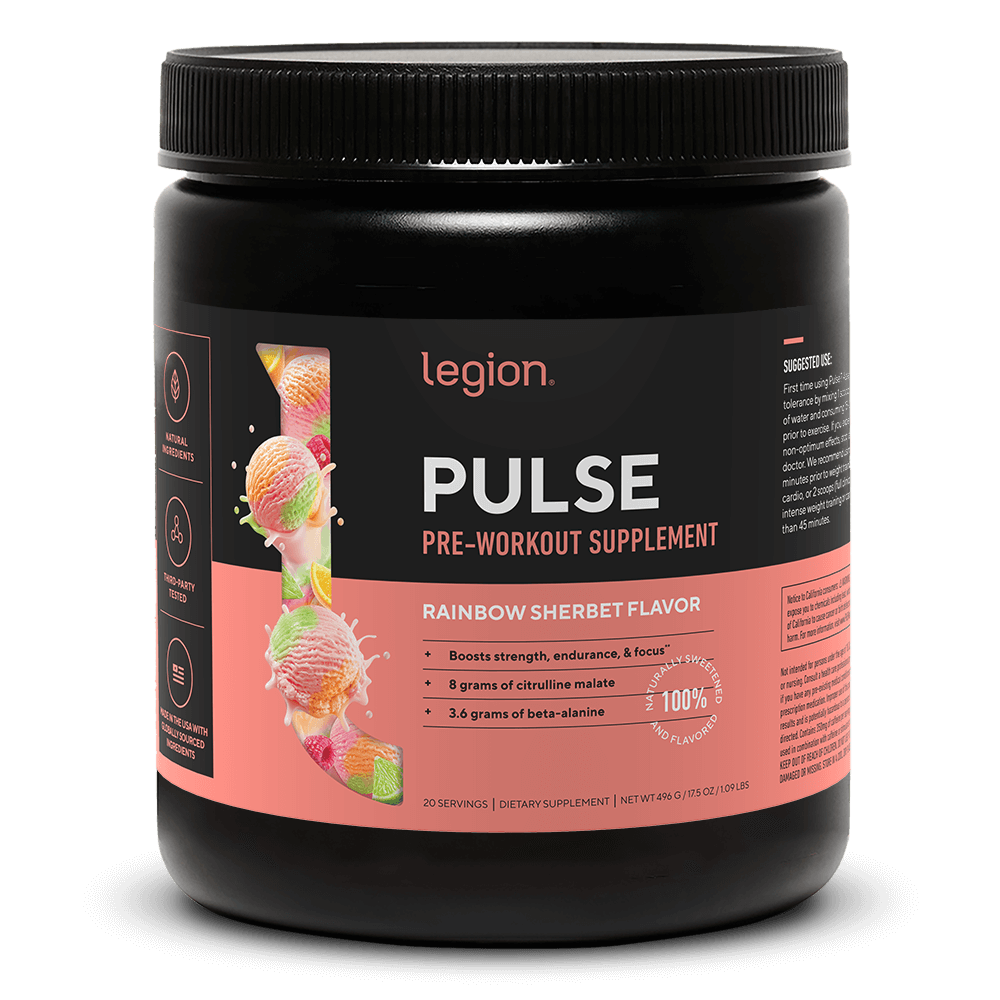 LEGION PULSE Pre Workout Drink – Rainbow Sherbet Flavor | Caffeine Free, Stim Free Formula for Clean Energy, Focus & Endurance