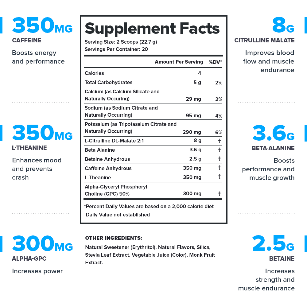 Discover the only naturally sweetened and flavored, stimulant-free pre-workout supplement formulated with clinically effective doses of 4 scientifically proven ingredients designed to boost strength, enhance stamina, and reduce fatigue — all without jitters or post-workout crashes.