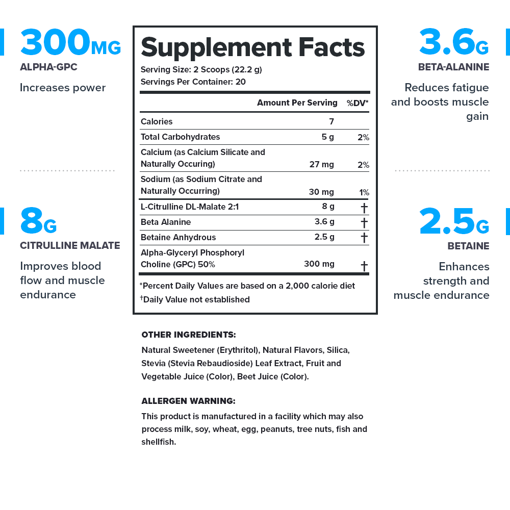 Discover the only naturally sweetened and flavored, stimulant-free pre-workout supplement formulated with clinically effective doses of 4 scientifically proven ingredients designed to boost strength, enhance stamina, and reduce fatigue — all without jitters or post-workout crashes.