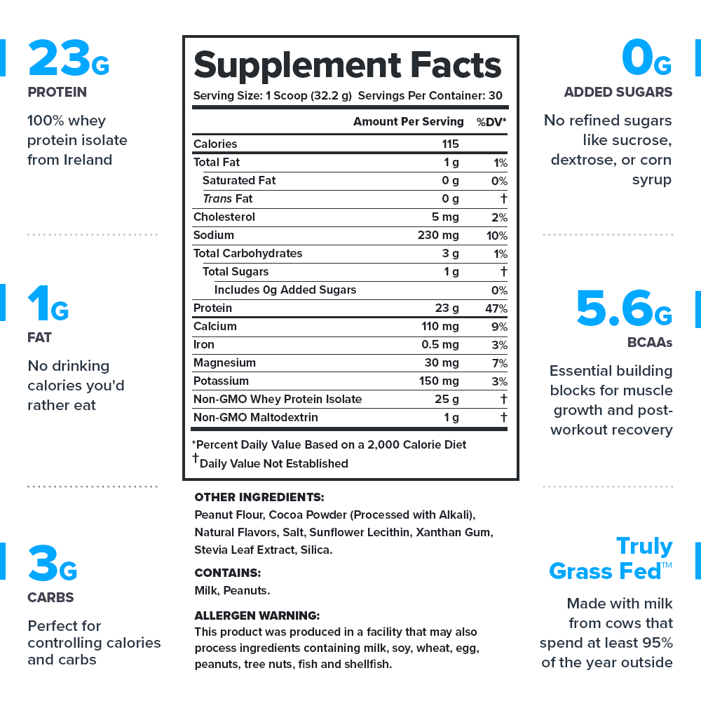Get naturally sweetened and flavored whey protein isolate powder, made with Truly Grass Fed™ certified milk from antibiotic- and hormone-free, pasture-raised cows in Ireland. Designed to be gentle on the stomach, it’s easy to digest and formulated to help you avoid bloating and discomfort — making it the perfect choice for clean, high-quality protein supplementation.