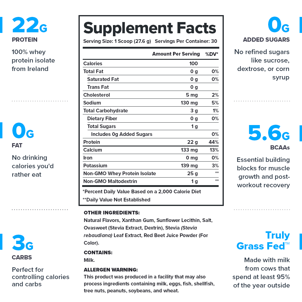 Get naturally sweetened and flavored whey protein isolate powder, made with Truly Grass Fed™ certified milk from antibiotic- and hormone-free, pasture-raised cows in Ireland. Designed to be gentle on the stomach, it’s easy to digest and formulated to help you avoid bloating and discomfort — making it the perfect choice for clean, high-quality protein supplementation.